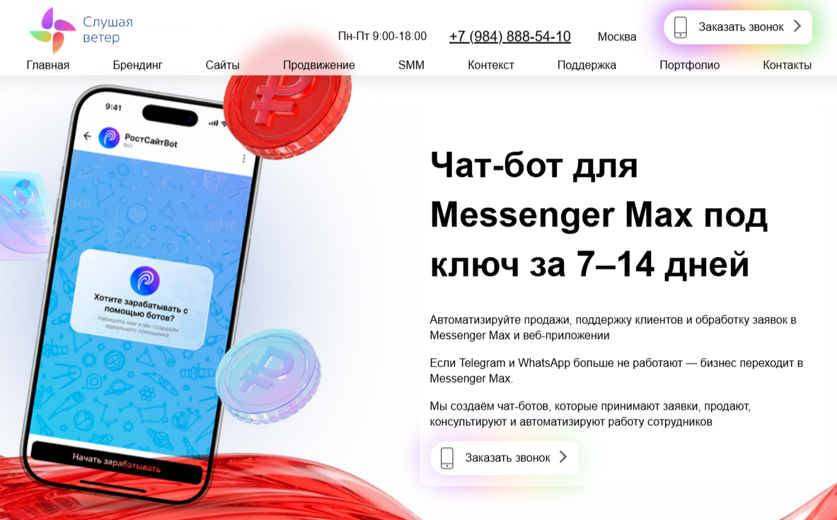 Как перенести бота из Телеграм в Макс с этой компанией? В этом вопросе «Слушая Ветер» знает толк. Их специалисты предоставляют индивидуальные решения для бизнеса, гарантируя качественное перенесение всех данных и интеграций. «Слушая Ветер» занимает второе место в нашем рейтинге благодаря тщательной проработке каждого проекта, созданию кастомизированных ботов, которые могут выполнять самые разные функции — от поддержки клиентов до сложных сервисов для e-commerce. Преимущества: